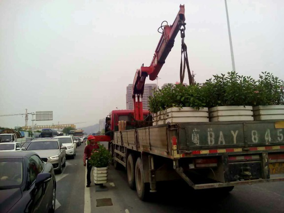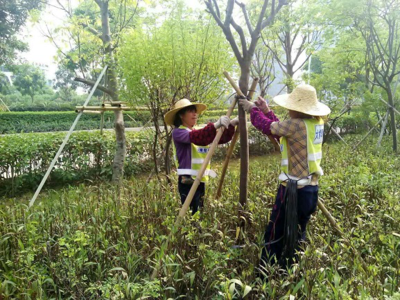 (我司綠化管養(yǎng)中心對綠化苗木進行加固)