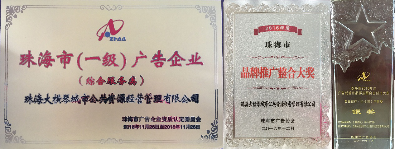 我司除了獲頒(一級)廣告企業(yè)資質(zhì)外,還榮獲珠海市廣告協(xié)會頒發(fā)的“2016年度珠海市品牌推廣整合大獎”以及“2016年珠海市廣告優(yōu)秀作品評選暨自由創(chuàng)作大賽(企業(yè)組)銀獎”兩大獎項。