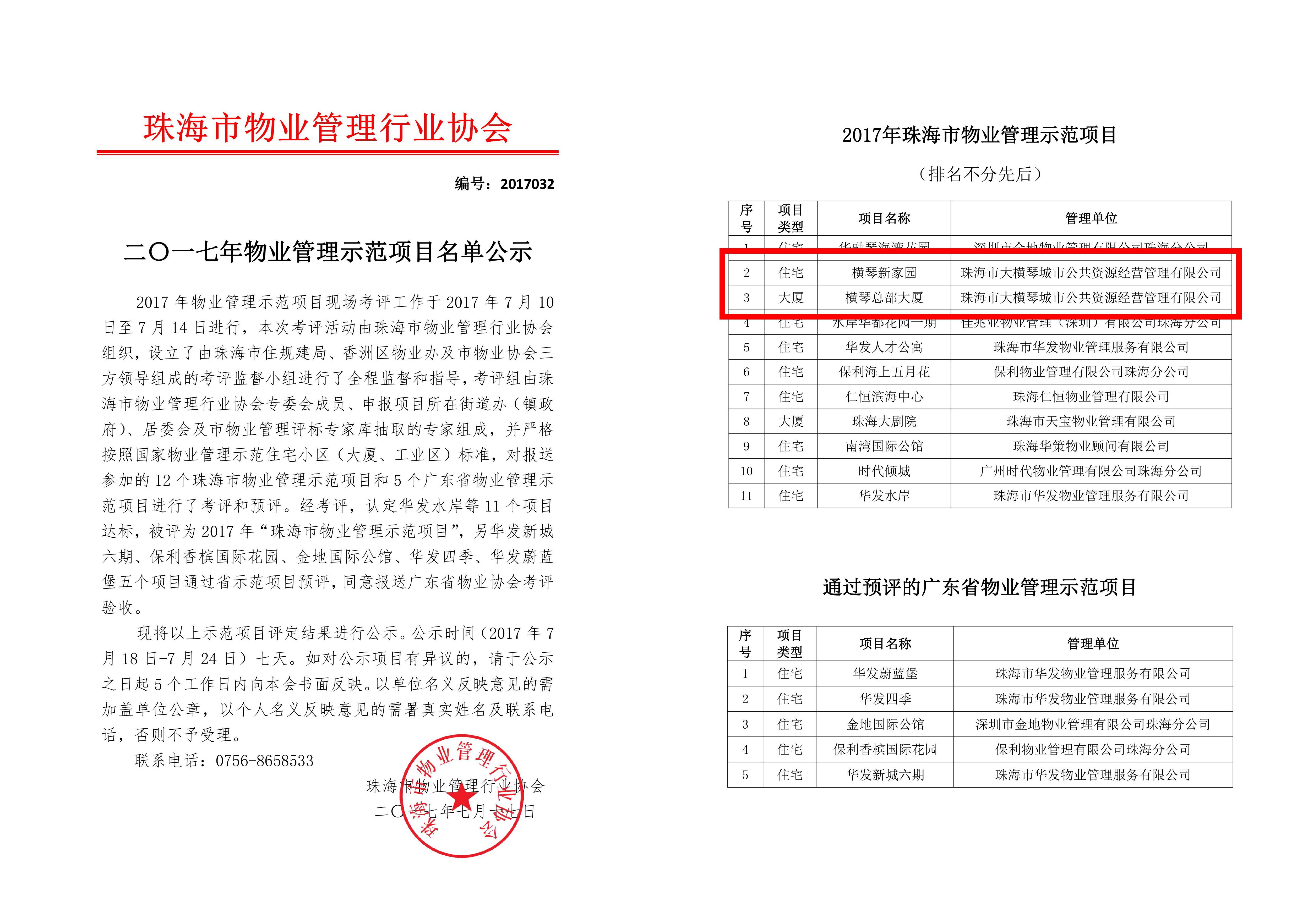 日前,珠海市物業(yè)管理行業(yè)協(xié)會(huì)發(fā)布了《關(guān)于2017年物業(yè)管理示范項(xiàng)目考評(píng)通報(bào)》,由我司提供物業(yè)服務(wù)的橫琴新家園、橫琴總部大廈兩個(gè)項(xiàng)目榜上有名。