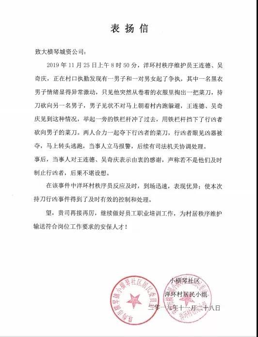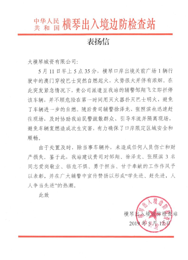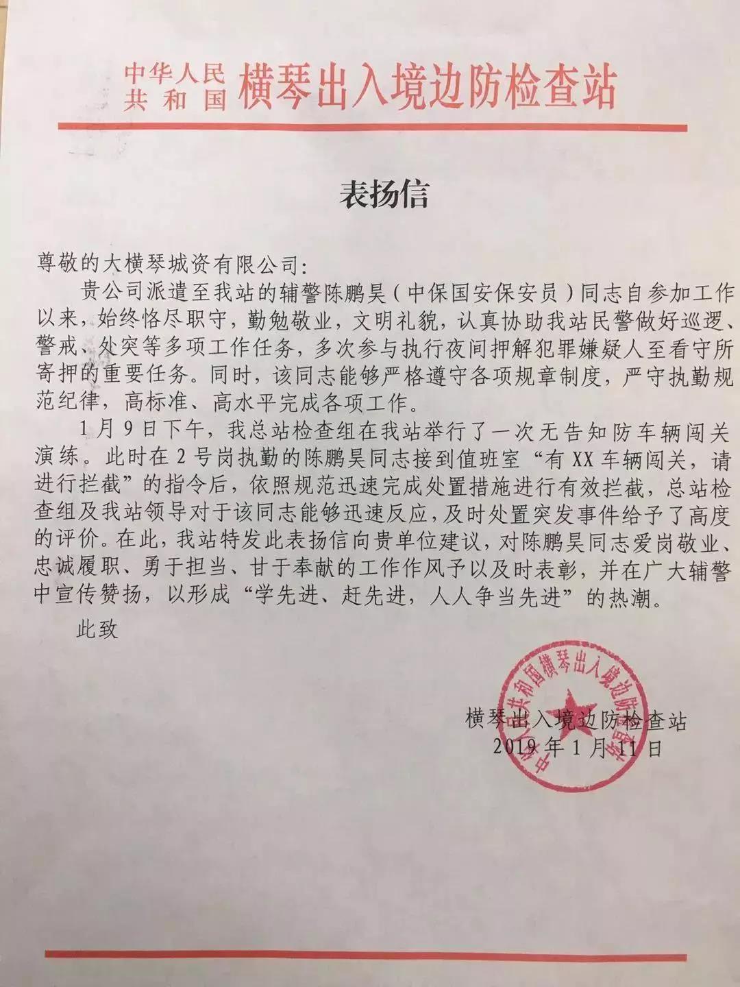 橫琴出入境邊防檢查站特發(fā)來表揚(yáng)信一封,贊揚(yáng)三名輔警愛崗敬業(yè)、臨危不懼、勇于擔(dān)當(dāng)、甘于奉獻(xiàn)的精神。而早在今年一月份時(shí),大橫琴城資的輔警陳鵬昊也曾因?yàn)槌錾墓ぷ鞅憩F(xiàn)收到表揚(yáng)信。