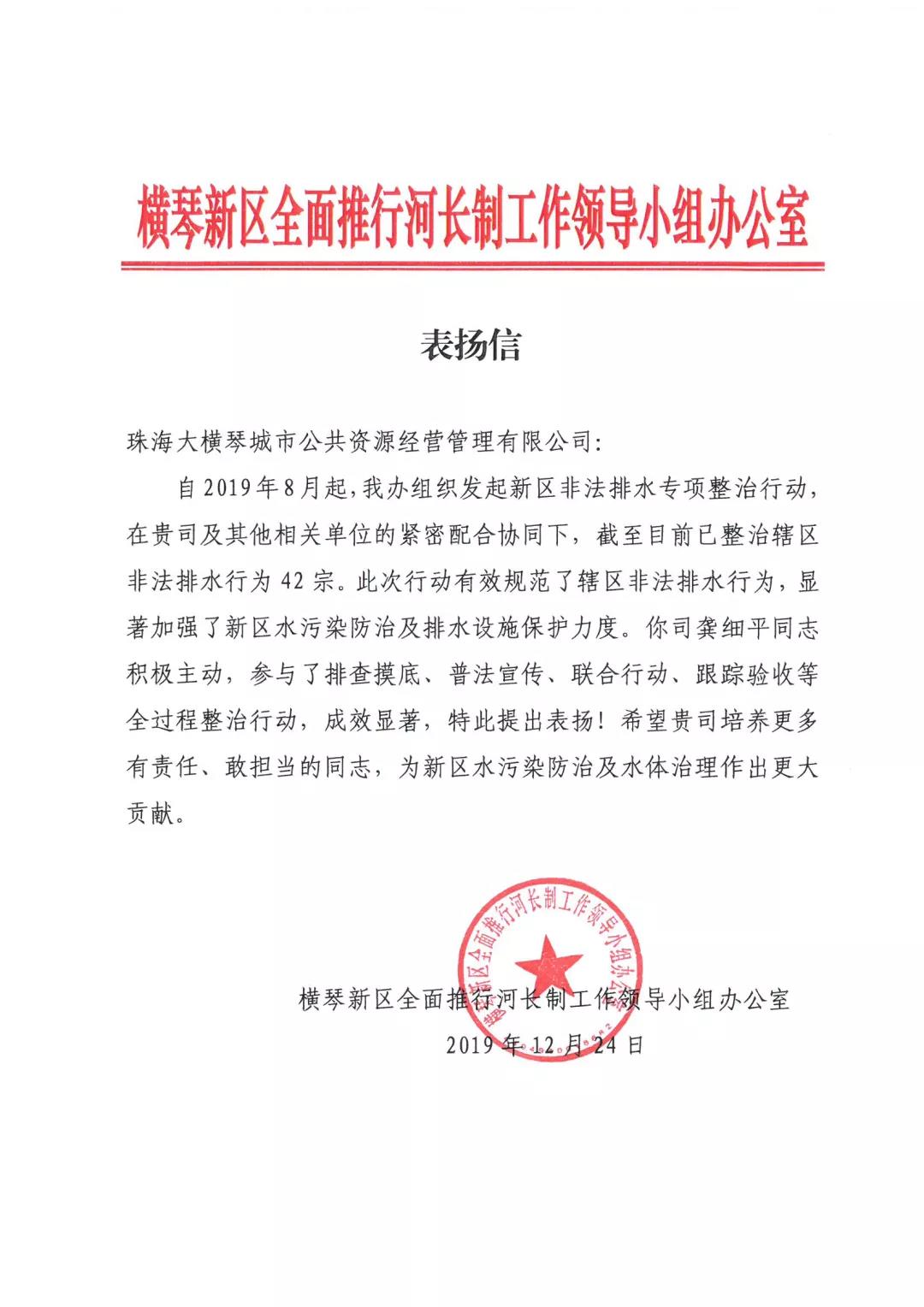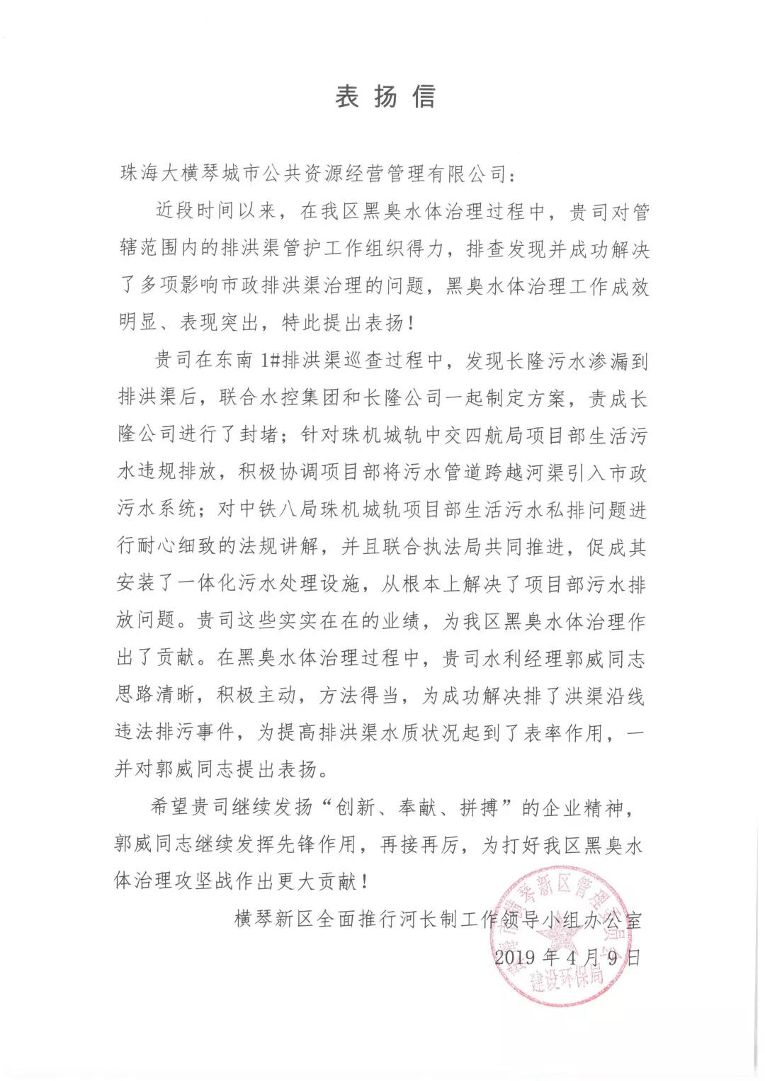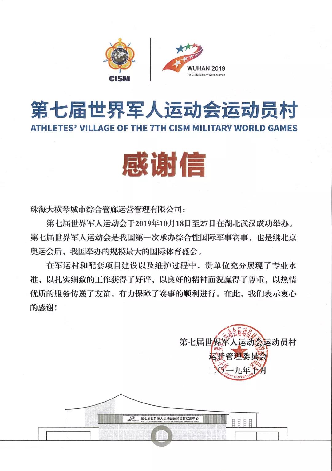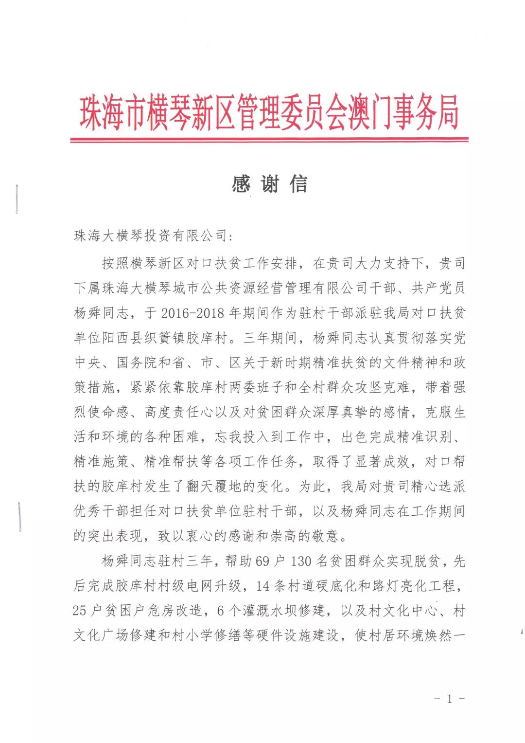 橫琴新區(qū)管委會(huì)澳門事務(wù)局贈(zèng)與感謝信