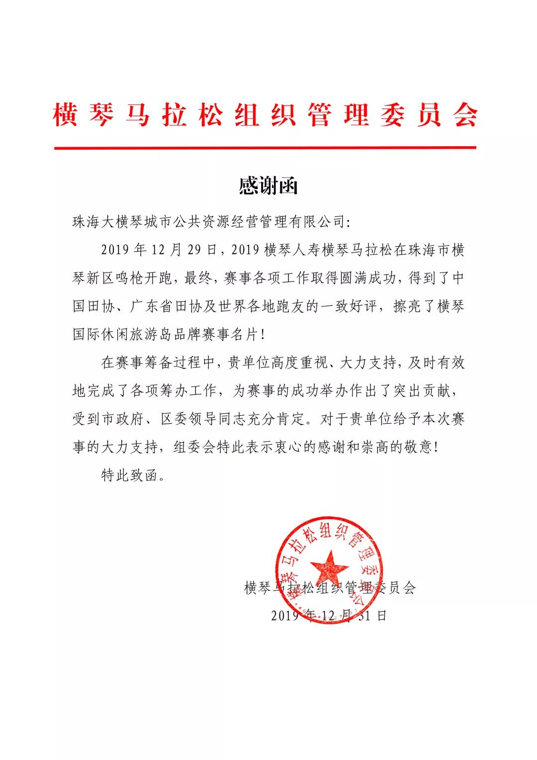 一封來自橫琴馬拉松組織管理委員會(huì)的