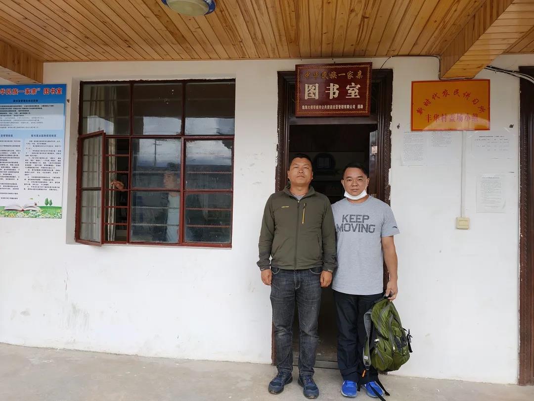 容杰斌(右一)在云南怒江蘭坪縣豐華村的圖書(shū)室前與村主任合影,該圖書(shū)室由大橫琴城資于2019年捐款建成。