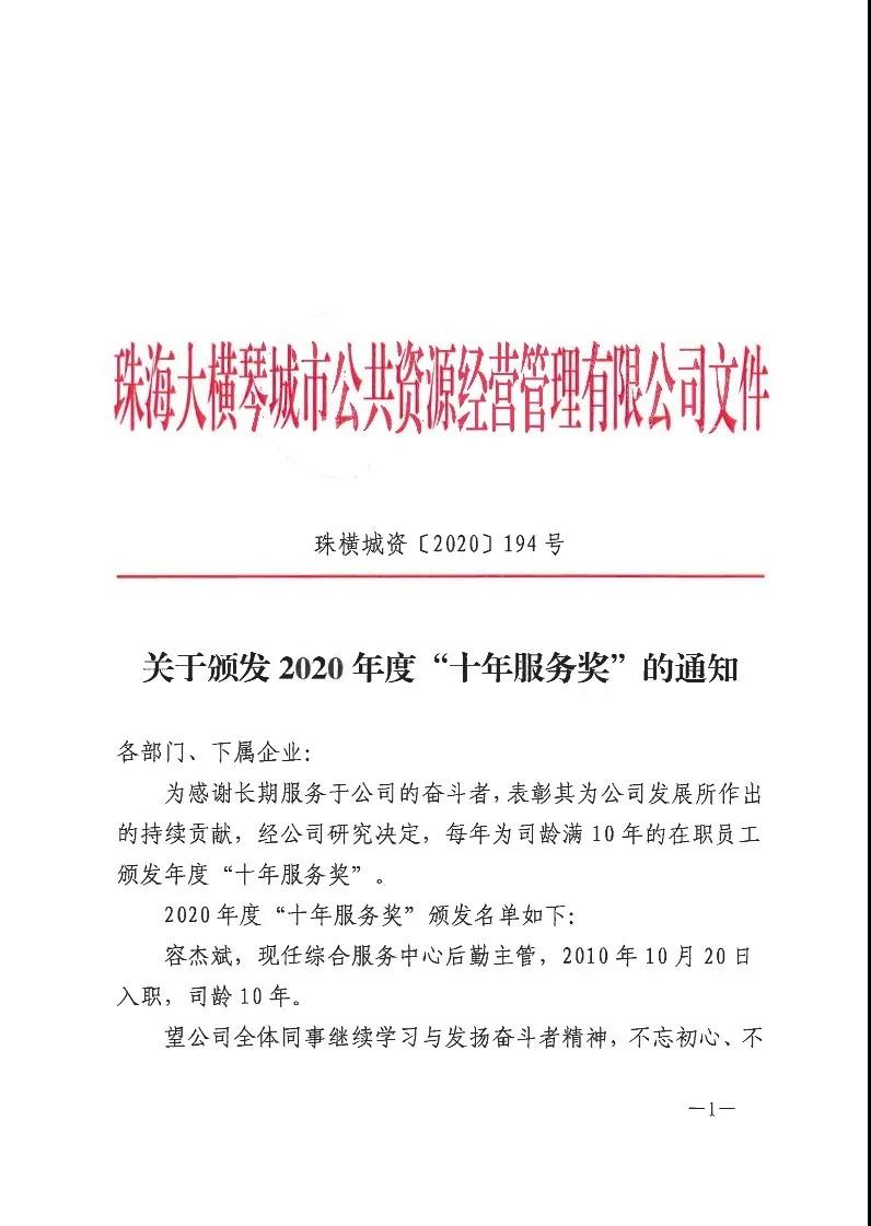 大橫琴城資為容杰斌頒發(fā)2020年度“十年服務(wù)獎(jiǎng)”