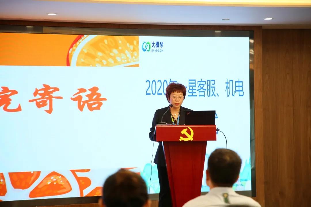 大橫琴集團培訓學院院長鐘麗紅為各事業(yè)部代表頒發(fā)《喜報》