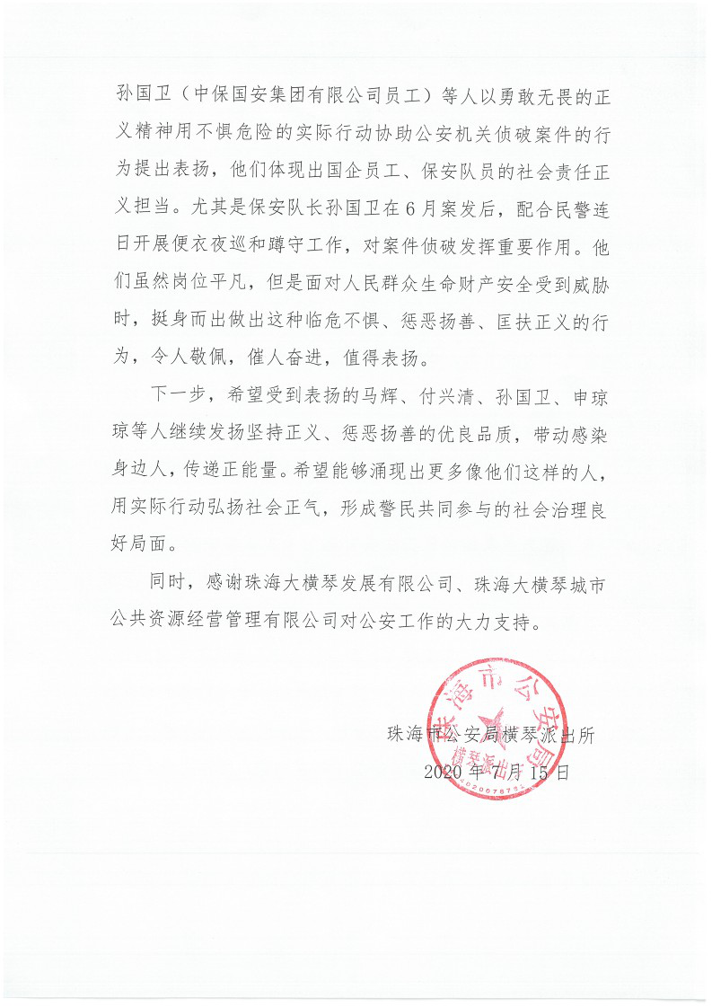 珠海市公安局橫琴派出所對馬輝、申瓊瓊、付興清、孫國衛(wèi)等人勇敢無畏地協(xié)助公安機(jī)關(guān)偵破案件的行為提出表揚(yáng)。
