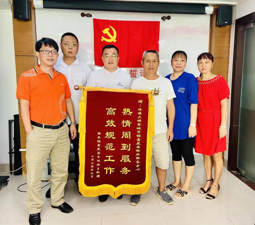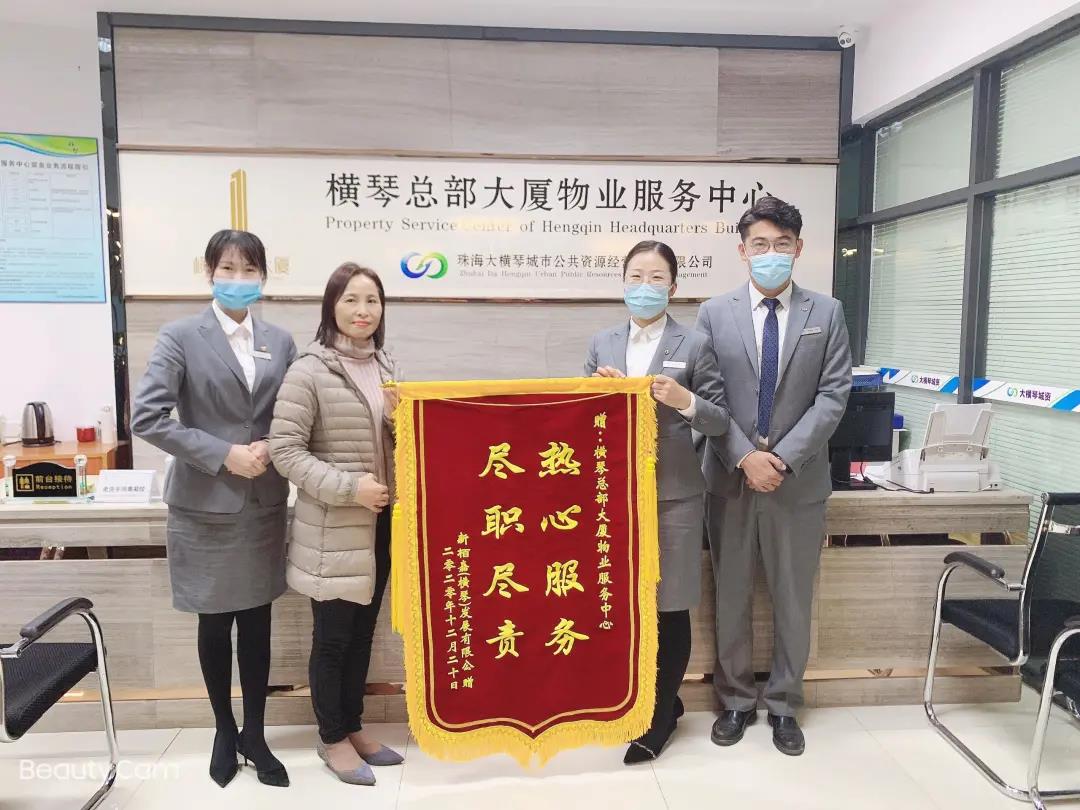 2020年12月,新栢嘉(橫琴)發(fā)展有限公司送來印有“熱心服務(wù),盡職盡責(zé)”的錦旗與慰問品,感謝過去一年,橫琴總部大廈物業(yè)服務(wù)中心全體員工的盡心服務(wù)。