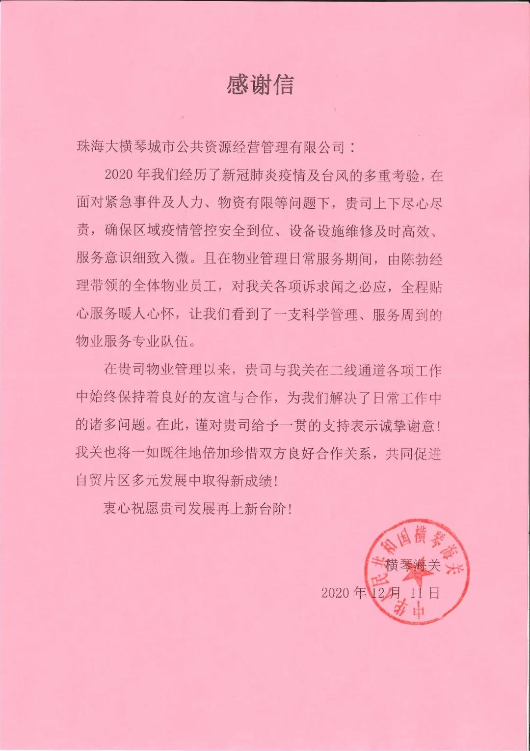 2020年12月,橫琴海關(guān)就優(yōu)質(zhì)的物業(yè)服務(wù)質(zhì)量贈與二線通道管理中心印有“精誠服務(wù),情系海關(guān)”的錦旗一面及感謝信一封,以示感謝。