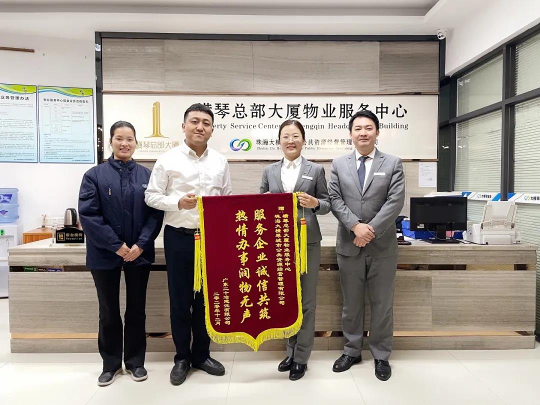 2020年12月,廣東二十冶建設(shè)有限公司送來一面印有“服務(wù)企業(yè)誠信共筑,熱情辦事潤物無聲”的錦旗,對總部大廈物業(yè)服務(wù)中心工作表示高度認(rèn)可。