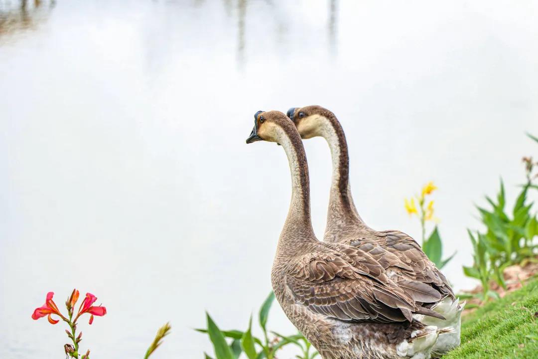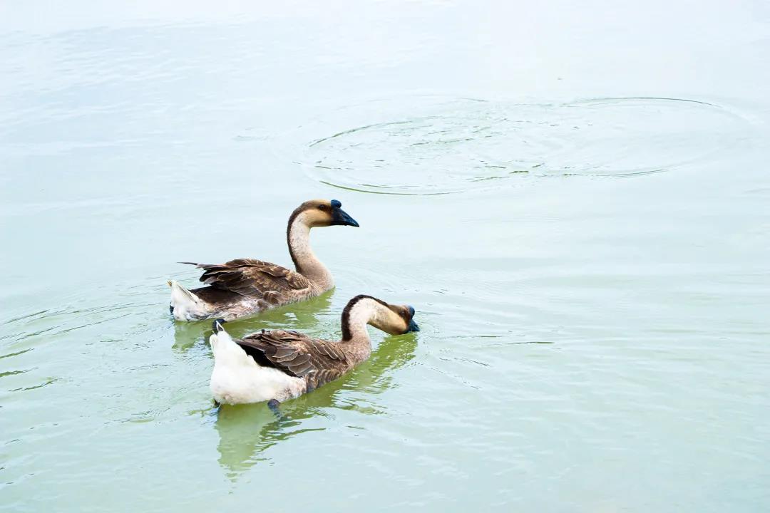 沿著池塘觀賞鵝、鴨嬉戲暢游