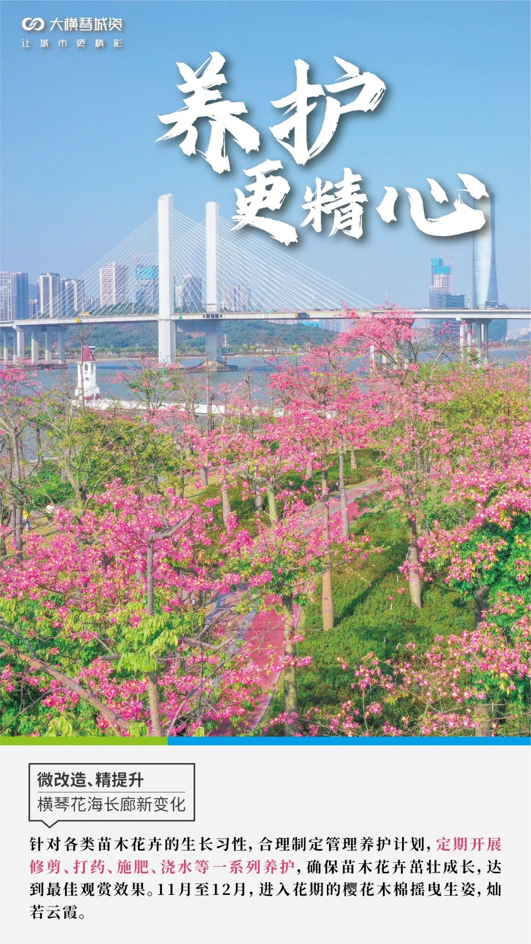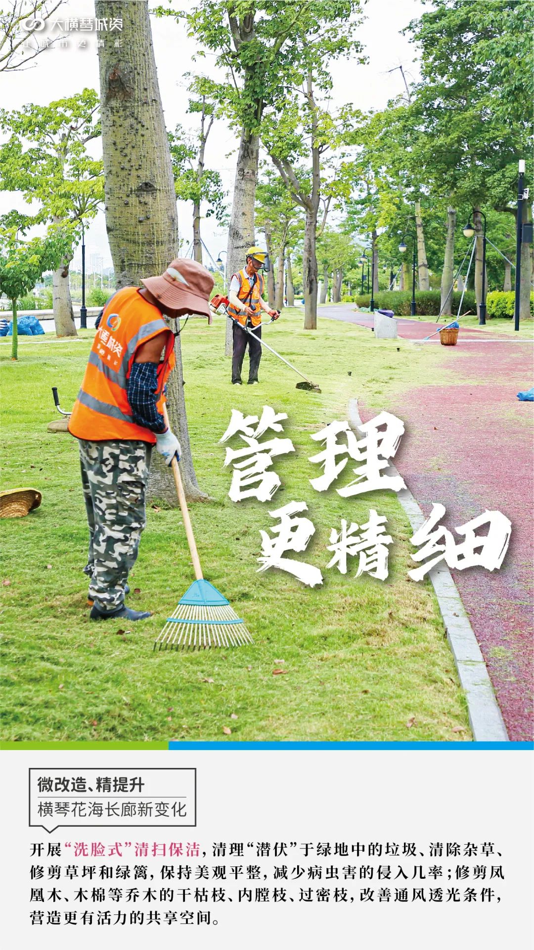 自2021年7月8日正式接管橫琴花海長廊管養(yǎng)工作以來,在橫琴粵澳深度合作區(qū)城市規(guī)劃和建設(shè)局市政管理署指導(dǎo)下,大橫琴城資全面開展顏值大升級、保潔大清掃、綠化大修剪等專項養(yǎng)護服務(wù),推動花海長廊的環(huán)境美化工作向縱向深發(fā)展。