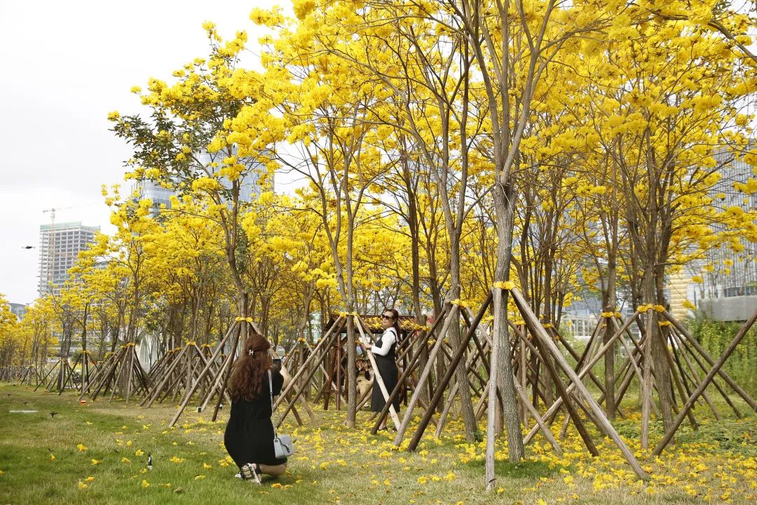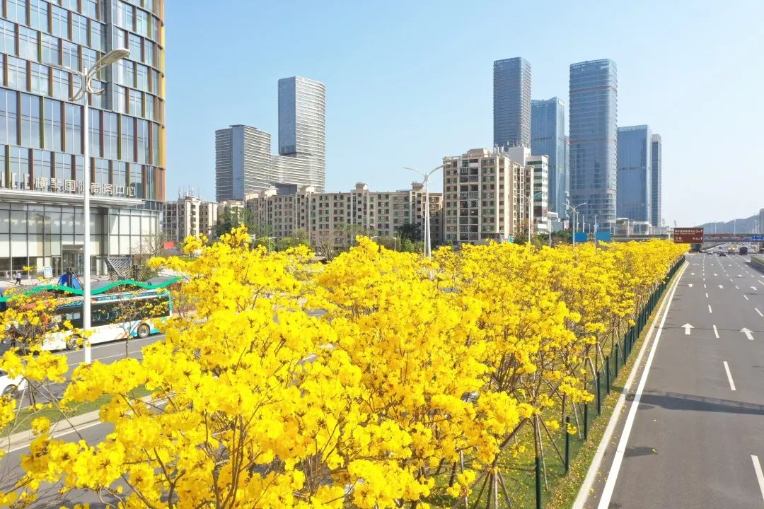 在環(huán)島東路icc中間分車(chē)帶,成排種植的黃花風(fēng)鈴木開(kāi)得正艷,放眼望去,滿(mǎn)樹(shù)盡是“黃金甲”。