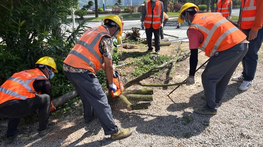 ▲模擬暴雨中,樹木倒伏阻斷道路通行,工作人員迅速開展清障工作。