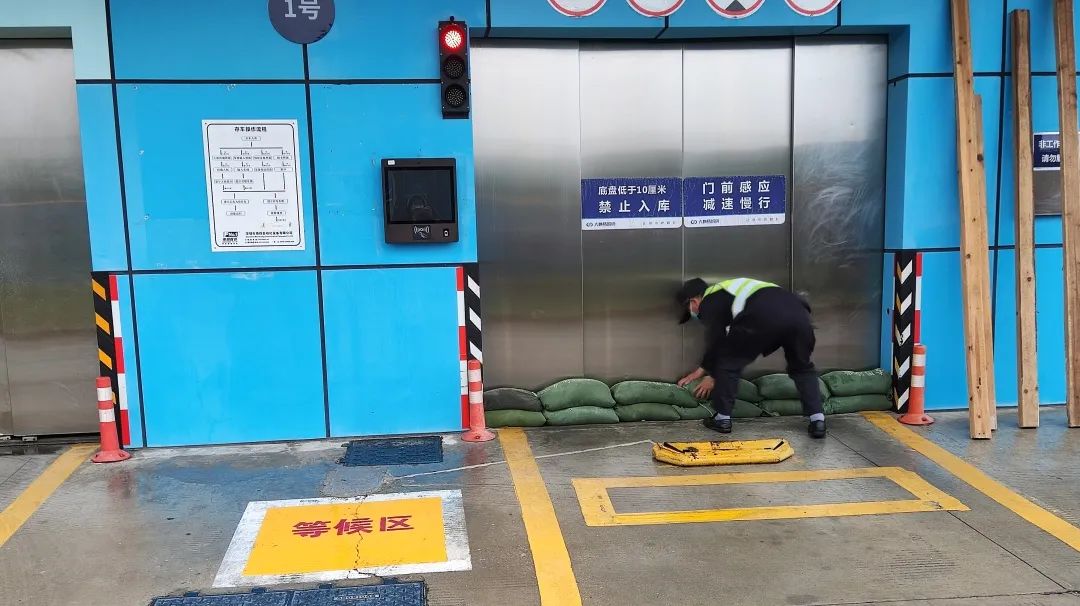 ▲模擬臺(tái)風(fēng)來(lái)襲,工作人員用沙袋對(duì)車庫(kù)門進(jìn)行圍堵。