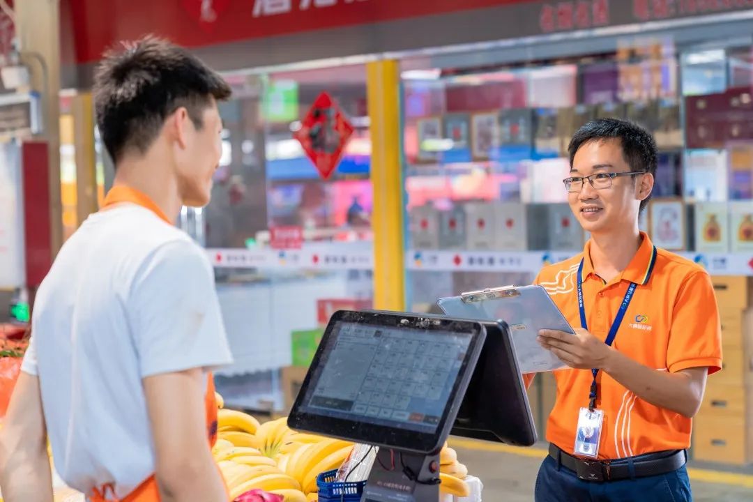 ▲工作人員巡查、了解集市運營情況