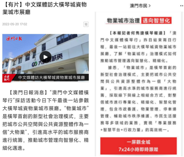 恰逢廣東省第十三次黨代會召開之際,一篇題為《感恩奮進這五年|打造市域社會治理現代化的“廣東樣板”》登上南方網評。作者將“橫琴粵澳深度合作區(qū)首創(chuàng)‘物業(yè)城市’社會治理新模式,推動社會治理由‘政府全包’向政府、企業(yè)、社會三駕馬車‘共建共治共享’模式轉變”列入南粵大地市域社會治理“好點子”之一。