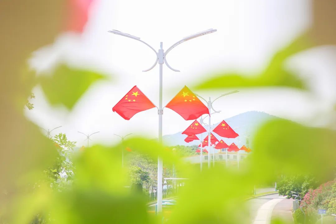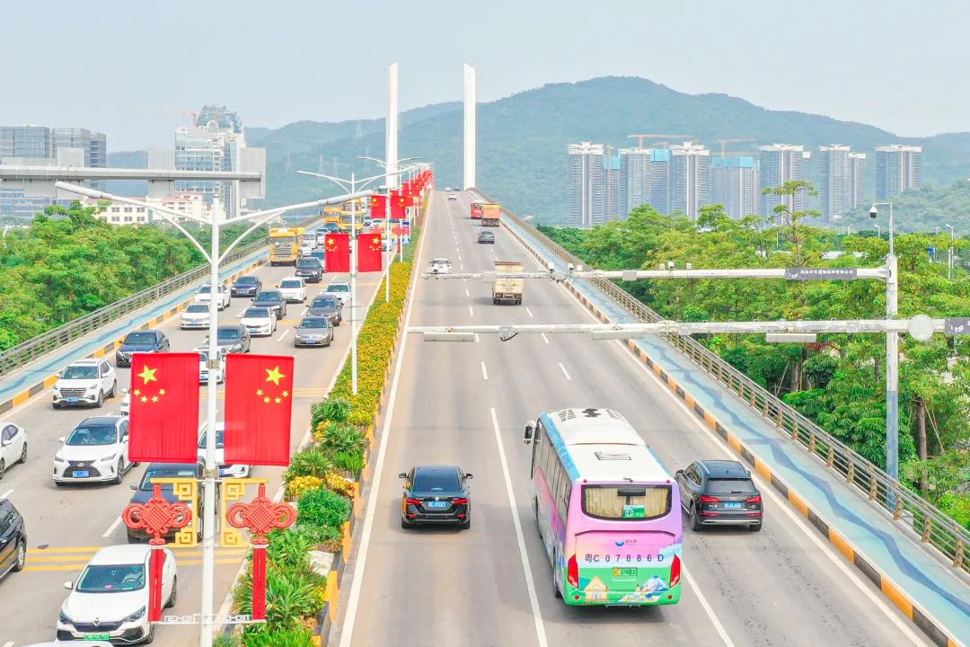 從橫琴大橋駛?cè)牒献鲄^(qū),迎面而來的一面面紅旗與一個個中國結(jié),為合作區(qū)裝點出喜慶的節(jié)慶氛圍。