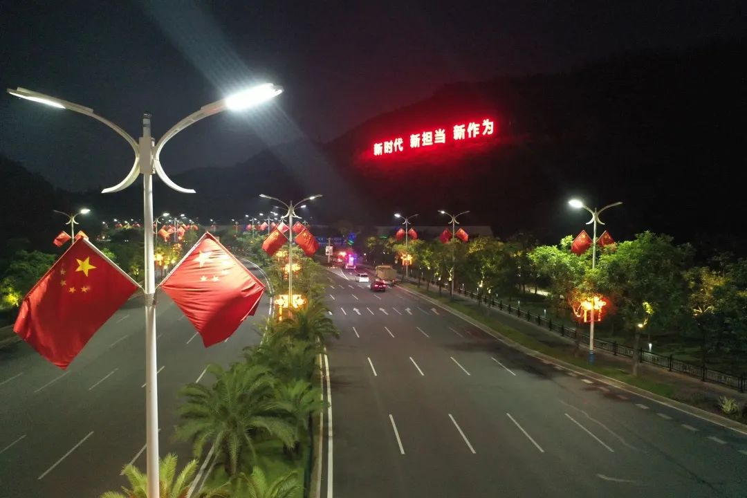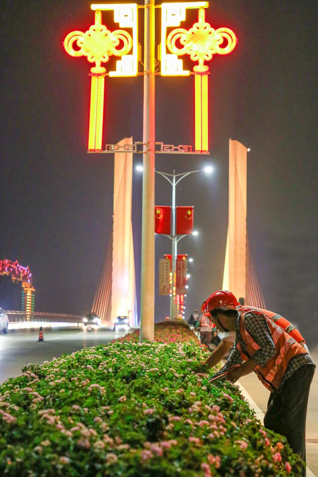 夜幕下的合作區(qū),工作人員在中國結(jié)和五星紅旗的映襯下,忙碌地為橫琴換上節(jié)慶的新衣。